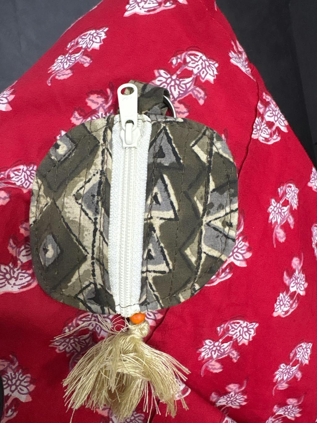 Keep your essentials stylishly secure with this beautifully handcrafted round pouch. Made from traditional block-printed fabric, this compact accessory features a convenient zipper closure and a metal keyring for easy attachment to your bag or keys. This pouch is adorned with a charming tassel, adding a unique and decorative touch.
